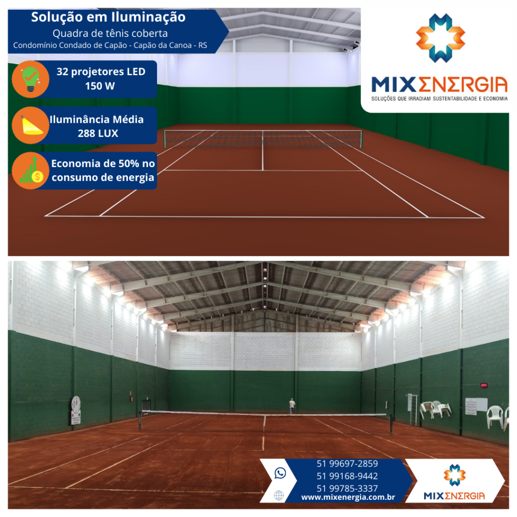 Solução em iluminação para quadra de tênis coberta no condomínio Condado de Capão, em Capão da Canoa, RS.