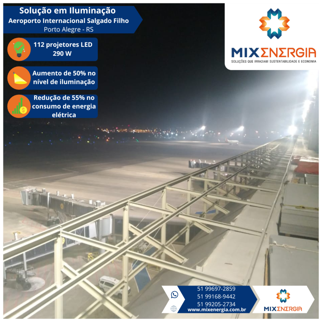 A Mix Energia realizou o projeto luminotécnico do pátio de aeronaves do Aeroporto Internacional Salgado Filho, em Porto Alegre – RS. Foi uma grande obra onde contamos com a parceria da Philips/Signify que realizou o fornecimento dos projetores LED, Montebras que foi responsável pela instalação e a Inovetech que nos apoiou na automação.