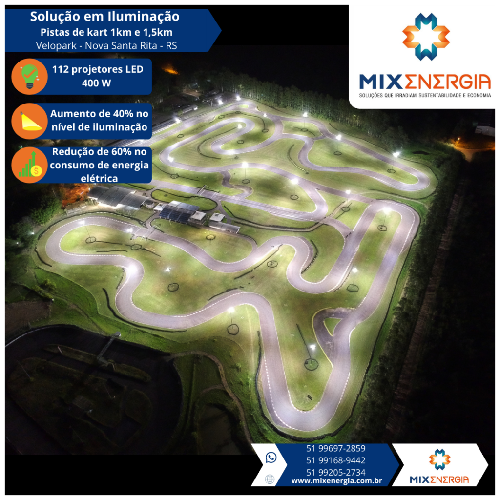 Solução em iluminação para pistas de Kart 1km e 1,5km do Velopark, de Nova Santa Rita RS.