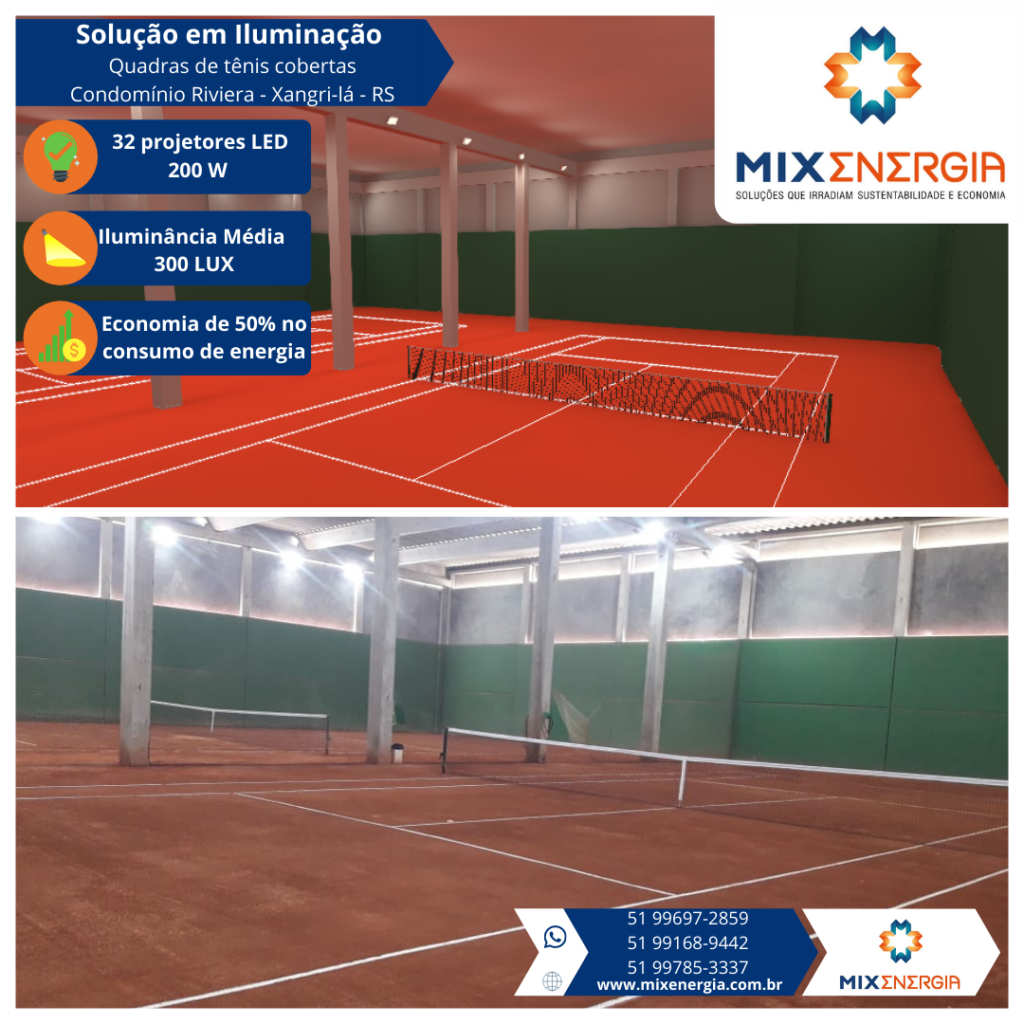Solução em iluminação para quadras de tênis cobertas no condomínio Riviera em Xangri-lá, RS.