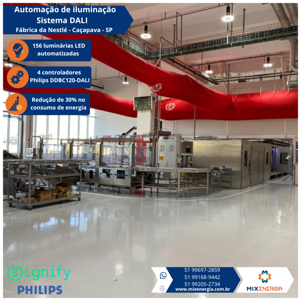 A Mix Energia realizou o serviço de configuração e comissionamento de sistema DALI para controle e automação de iluminação na fábrica da Nestlé em Caçapava, SP.