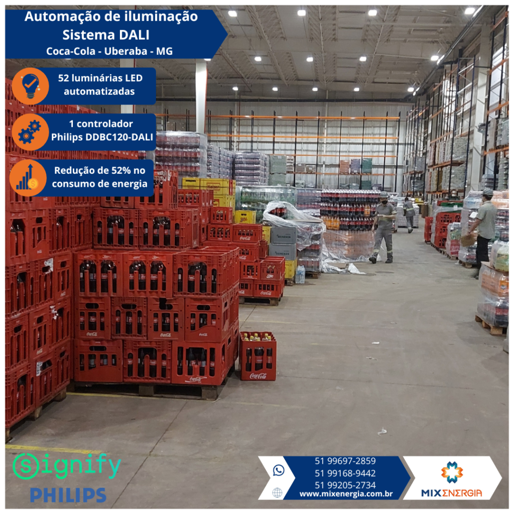 A implementação do sistema DALI possibilitou o aproveitamento de luz natural e o sensoriamento por presença em ambientes de porta paletes, além do controle digital e individual de cada luminária. O acionamento pode ser feito de forma automática através de calendários ou de forma manual através de botoeiras instaladas nos paineis. A economia de energia chegou a 70% após a substituição das luminárias convencionais por LED em conjunto com o controle DALI.